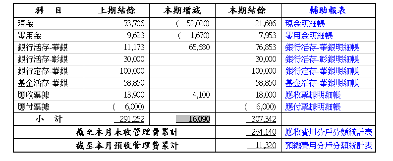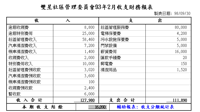 列印 [收支財務報表]作為公告報表,並附上各項統計的輔助報表供管委會查核,輔助報表包括收支分類統計表、現金收支明細帳、零用金明細帳、銀行戶頭明細帳、應收票據明細帳、應付票據明細帳。列印