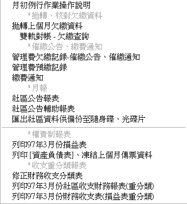 第一步先由 [社區管理費收費記錄] 將 [收費歸屬月份] 設為97年1月,並由 [表單功能選項] 執行 [更新繳費資料]。若有異常系統會作提示。