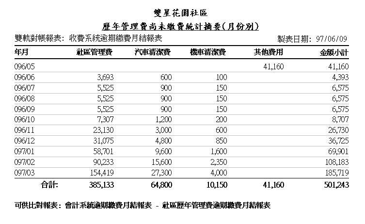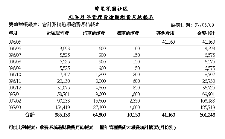 例如發現97年1月兩者的欠繳金額不相同,其原因可能為 [社區管理費收費記錄] 未被更新,或者 [社區管理費收費記錄] 的尚未繳費資料未被拋轉為會計系統的應收費用。